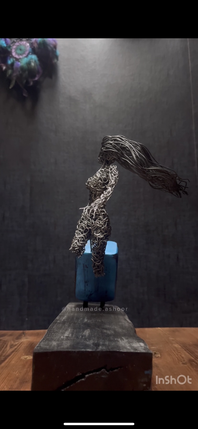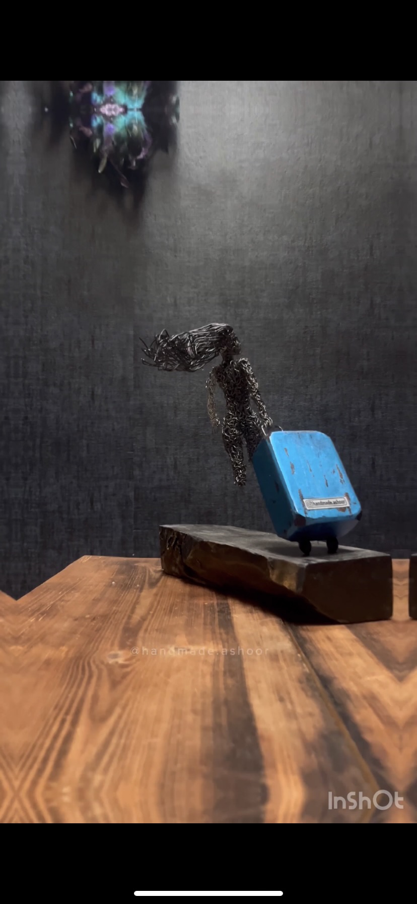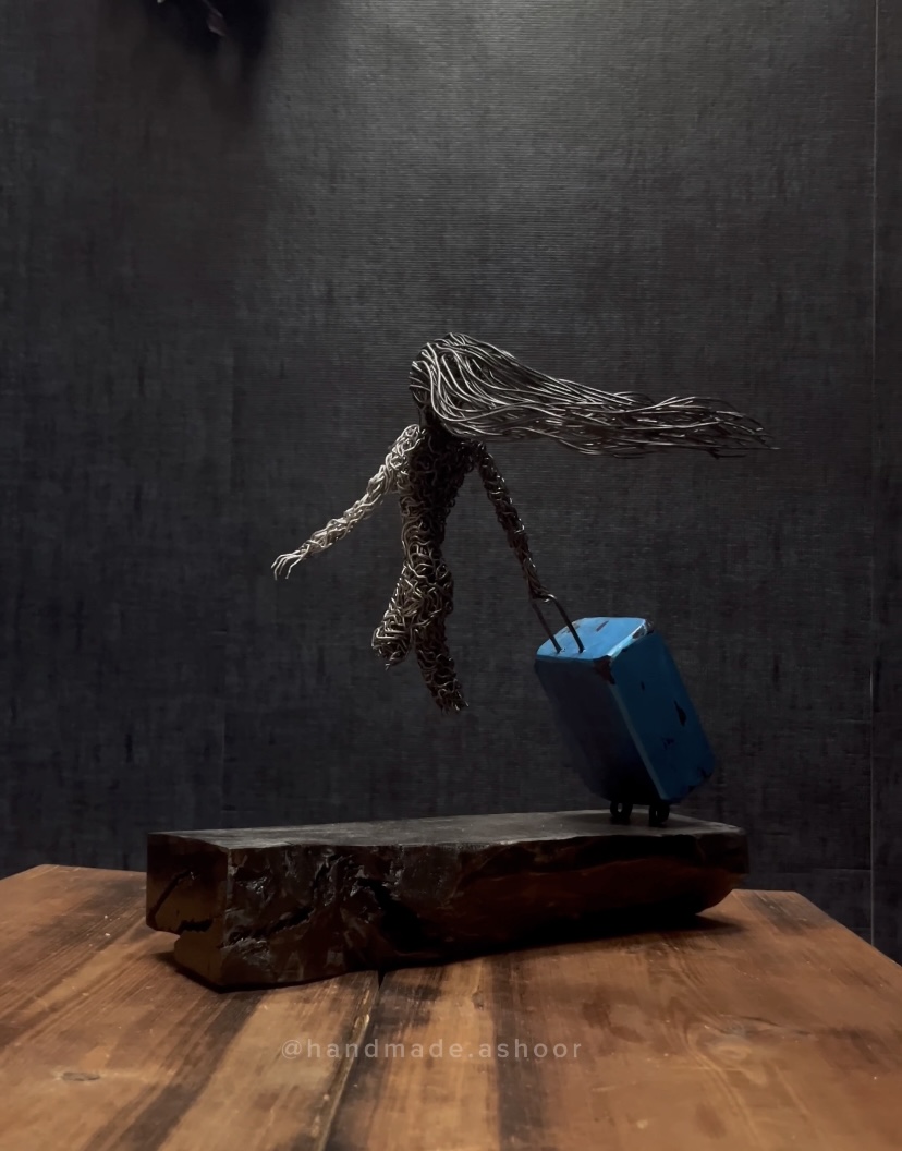 گفت ۹ ساله که از ایران مهاجرت کردم و برنگشتم، یه مجسمه مسافر میتونی برام بسازی؟شروع که کردم نمیدونستم اخرش پاهای مجسمه رو قطع میکنم. این مجسمه معلق بدون پا نشانگر تمام مسافرانی است که از ایران رفته اند ولیبخشهایی از خودشونو اینجا جا گذاشتند.نگاه رو به عقب زن مسافر در حالیکه به جلو قدم بر میداره بار مفهومی این مجسمه رو بیشتر کرده.