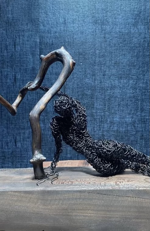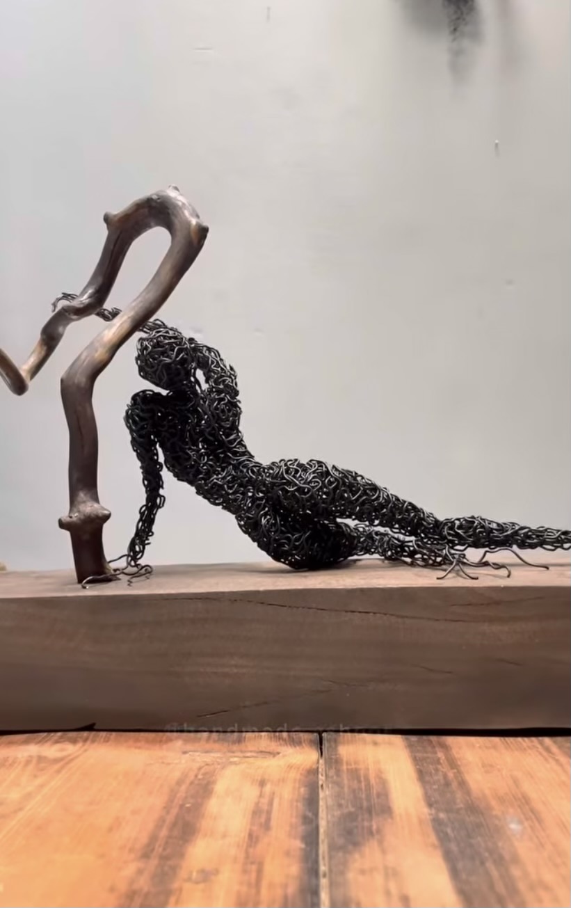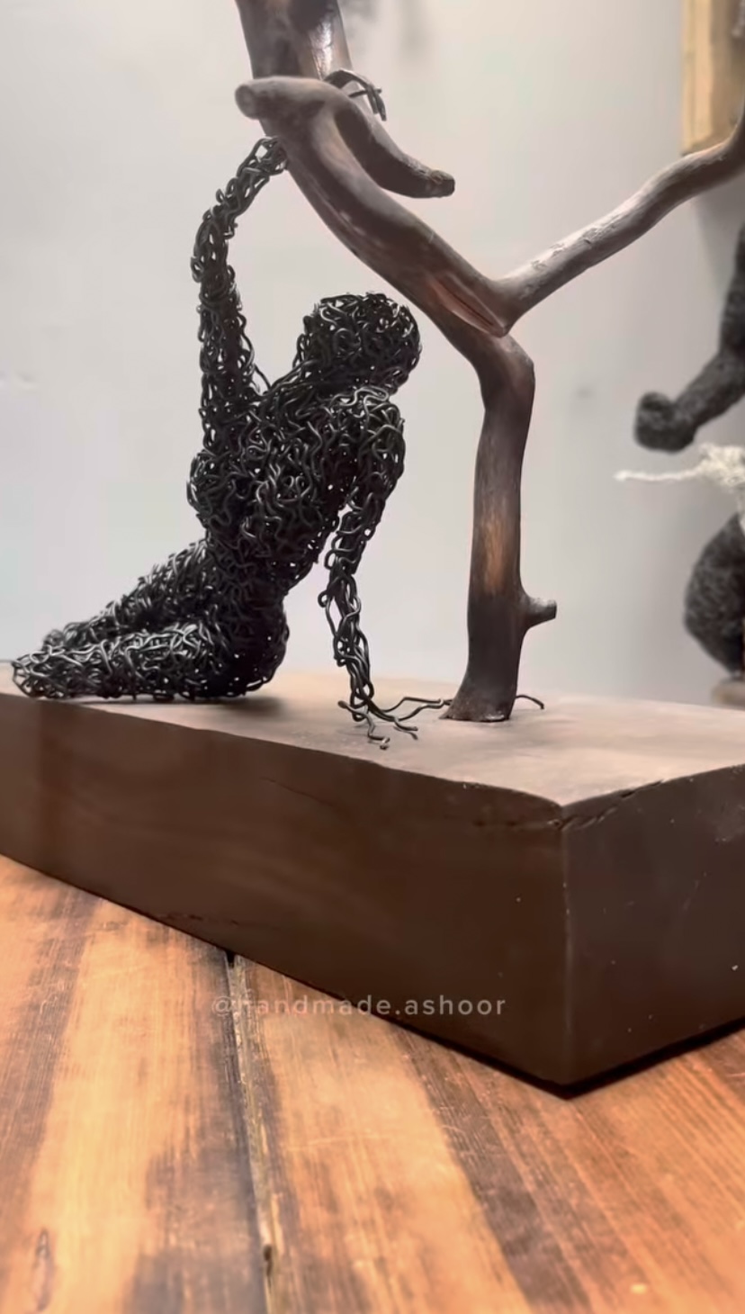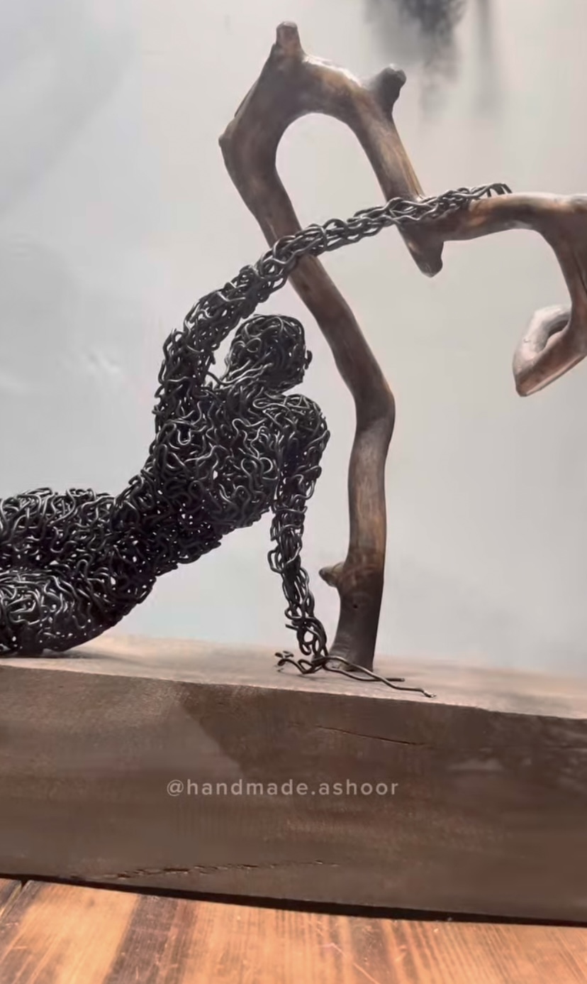 این زن گرچه دارای اندام زیبا و متناسبی است اما دستها و پاهایش انگار نا تمام و گویی در حال تجزیه و فروپاشی است، اما دستی که به درخت چنگ زده، کامل و سالم است.همان درختی که از زاویه ای خاص شکل قلب و نماد عشق است.گویی عشق پناهیی است برای فرار از فروپاشی…انگار زیبایی ظاهری بدون عشق مردنی است و عشق زندگی بخش انسان است.